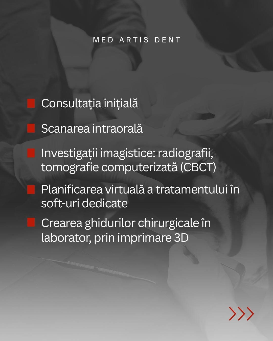 - Consultația inițială și investigațiile paraclinice (tomografie CBCT și un scanare digitală intraorală). La finalul acestei etape, medicul are o imagine completă a structurii osoase și a dinților existenți. [1]